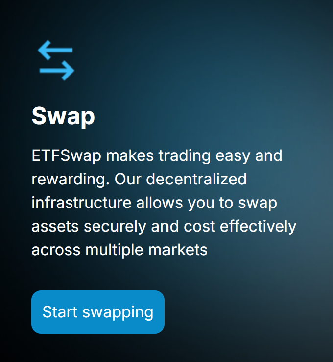 Welcome to ETFSwap, your dedicated tokenization platform for ETFs in cryptocurrency. Engage with this highly liquid asset class and benefit from the advantages of 24/7 risk management, flexibility, and seamless trading opportunities offered by ETF tokenization. Join us to explore the potential of blockchain ETFs.